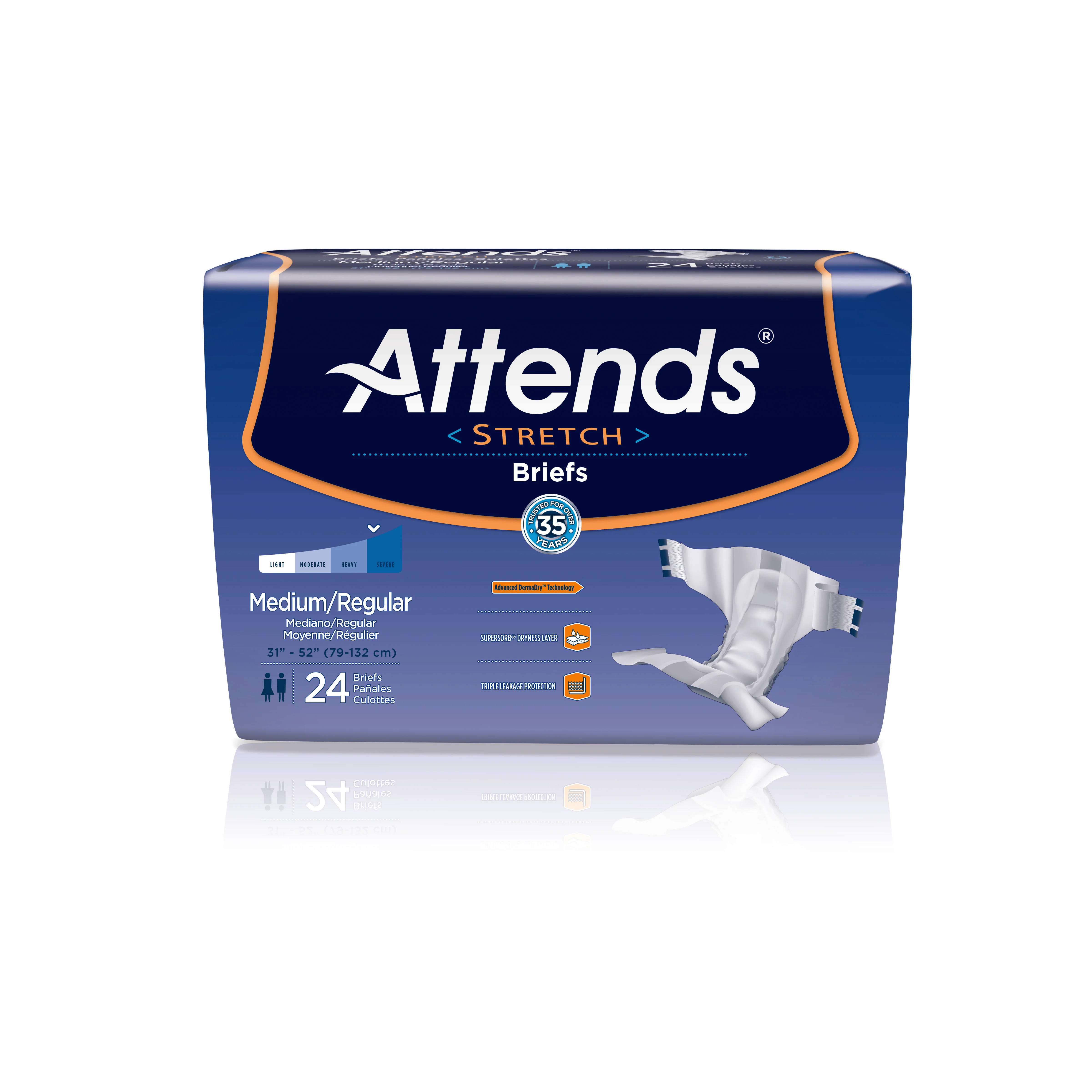 The Attends Stretch Brief speaks for itself. This premium brief has four-way stretch for individualized fit and comfort. We took our Advanced Brief and introduced stretchable side panels that contour around the body for a more secure fit. With twin stretch zones, these briefs have more stretchability than others brands to fit a wider range of waist sizes and body types. Perfect for heavy and severe incontinence, Attends Stretch incorporates all the advantages of our leading Advanced brief – dual core for absorbency; Dry-Lock® Dryness Layer for added dryness; soft, breathable, cloth-like material for comfort; barrier leg cuffs for leakage protection; and odor-blocking properties to ensure confidence and dignity. The Attends Stretch Brief is an all-around performer – when custom fit, maximum dryness and healthy skin are top priorities.